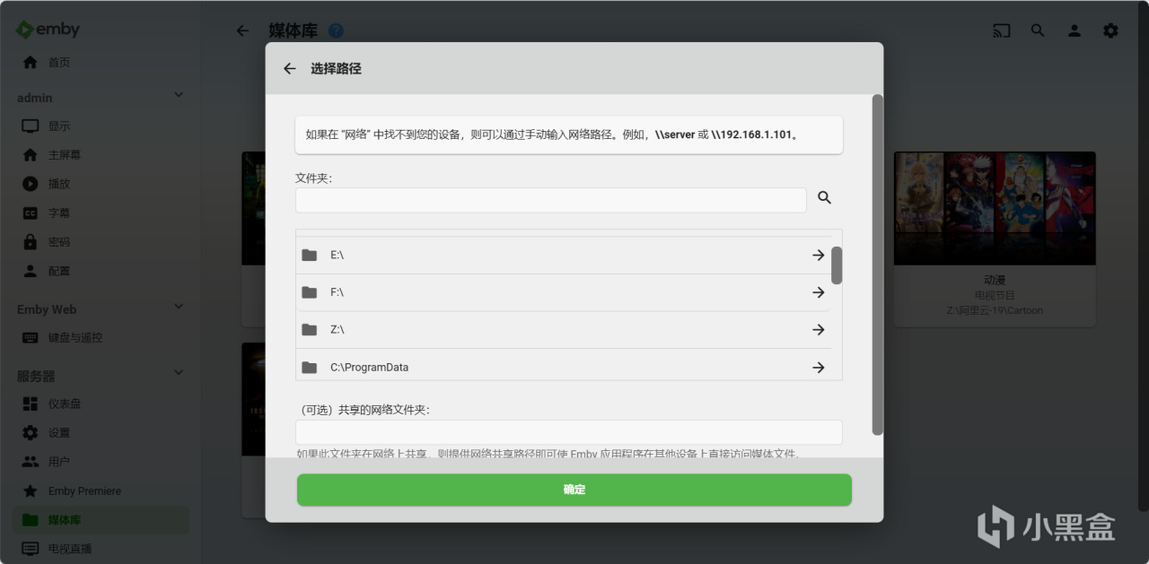 添加媒体库的时候,我的alist网盘挂载在本地的盘符为Z,那么选择Z盘即可,这样就顺利的把网盘内的媒体文件,导入到了Emby之中。