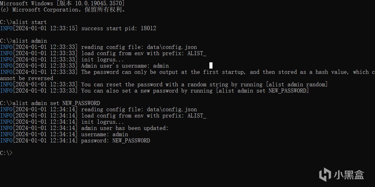 cmd命令框中依次输入:“aliststart”-意为启动alist服务,“alist admin” -意为查看alist管理账户, “alist admin set admin”-意为将alist管理密码改为admin。*修改完成不要关闭这个CMD 窗口,关闭alist就退出了。
