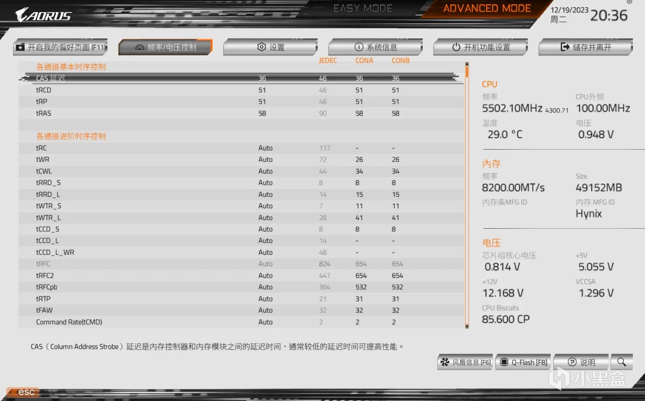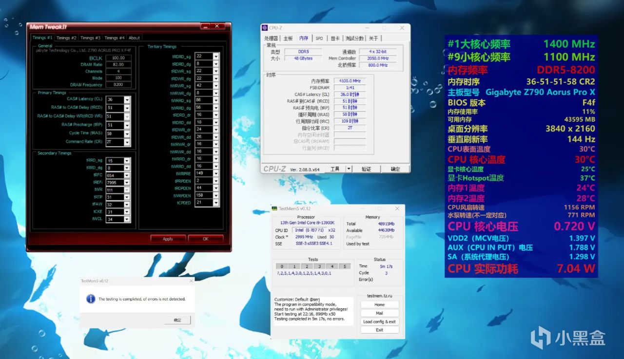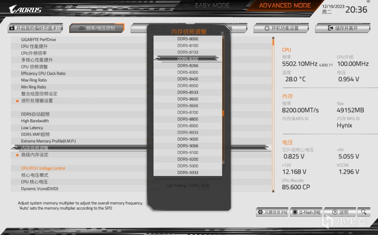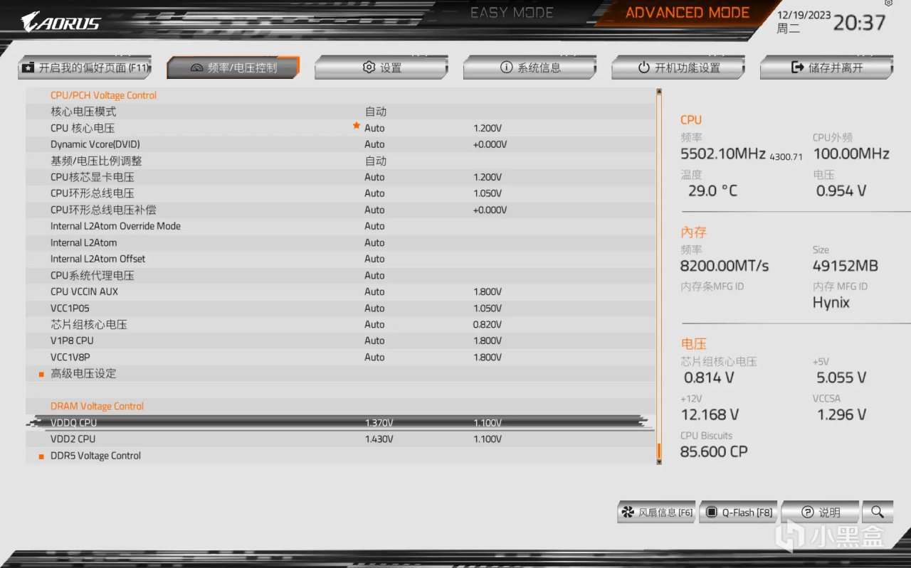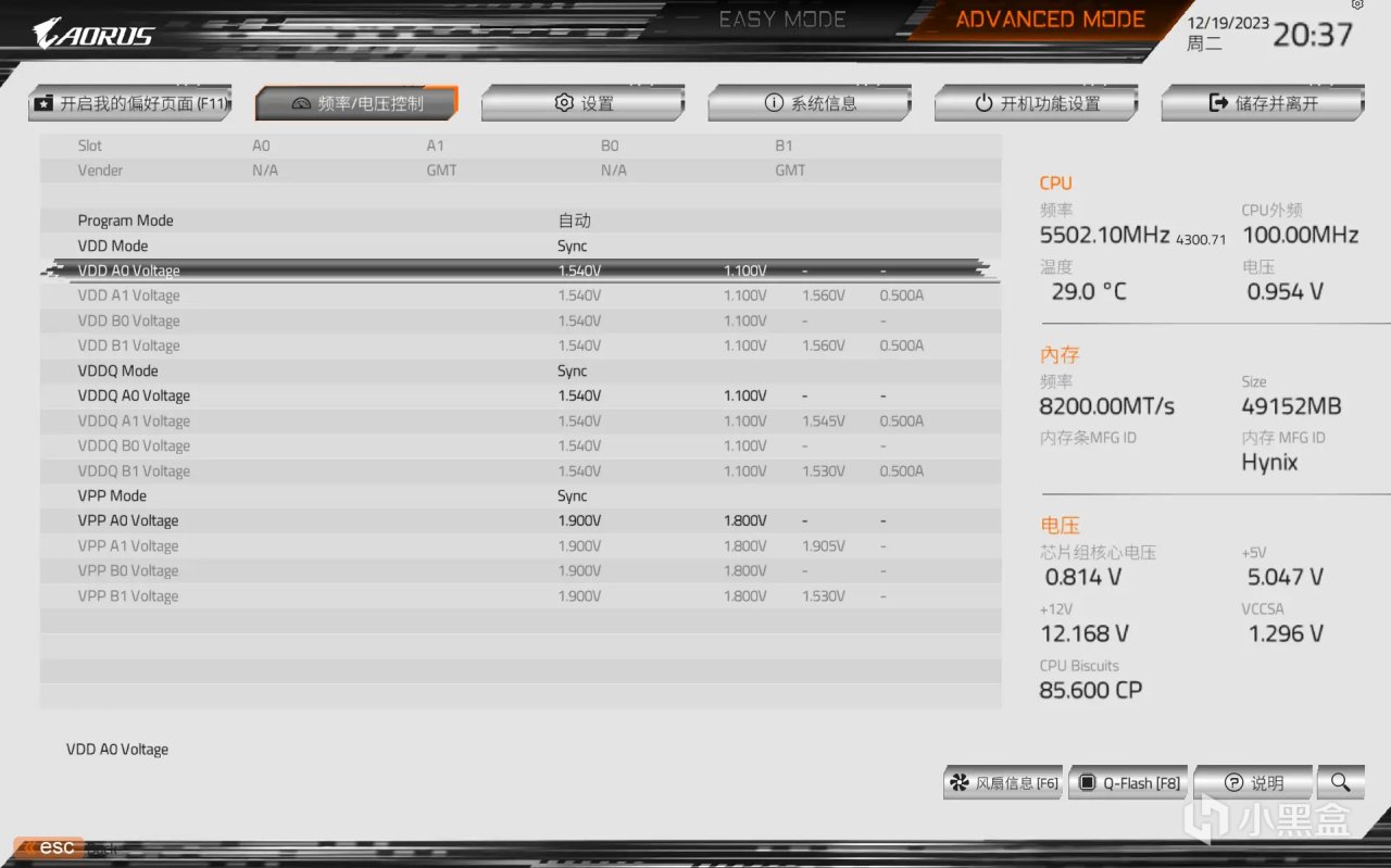 依旧是进入BIOS,手动把频率拉到8200MHz,经过一翻折腾之后,我终于找到了8200MHz频率下比较稳定的电压。CPU SA(CPU系统代理电压)不动,VDDQ这里我设置1.37V,VDD2设置1.43V,内存电压VDD设置为1.54V,VDDQ设置为1.54V ,VPP设置为1.90V。