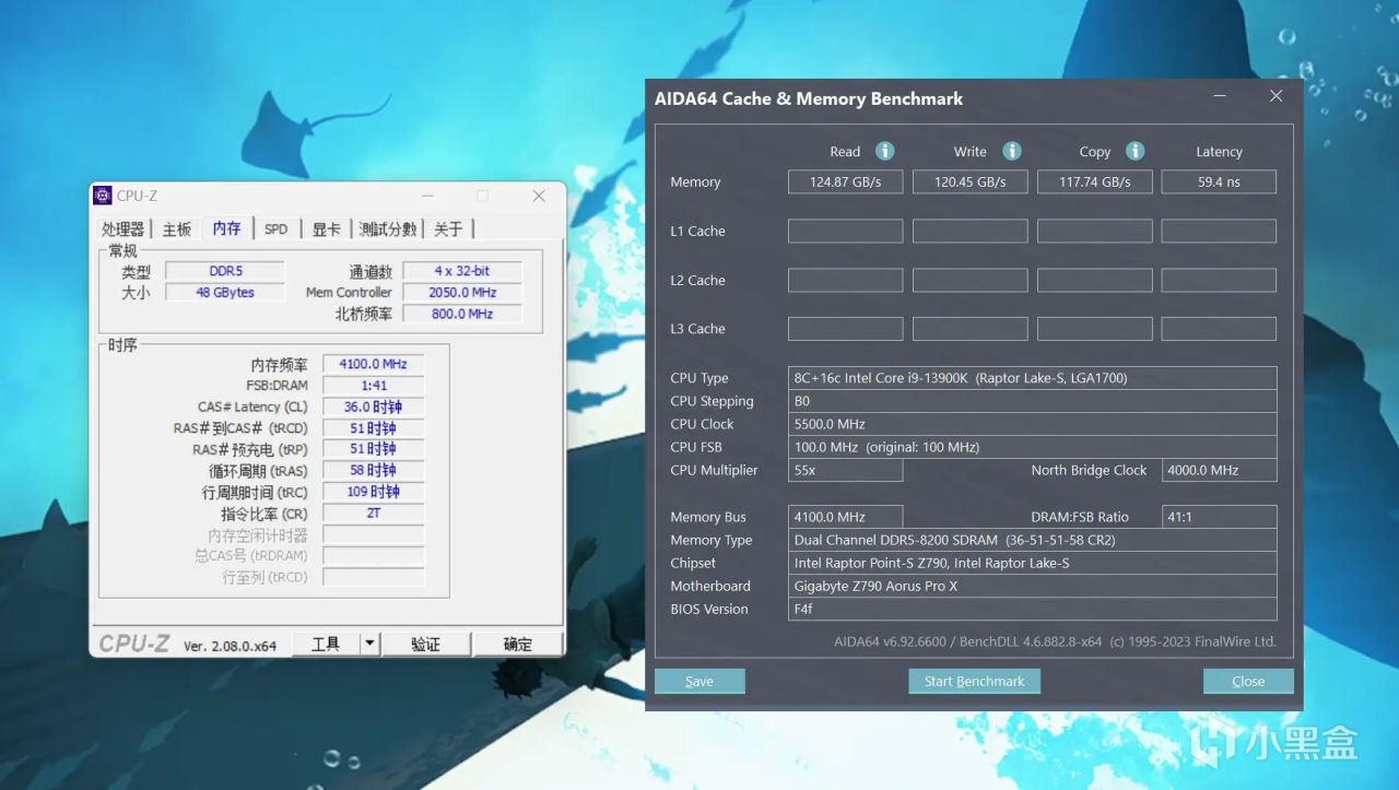 性能方面我这里也是使用鲁大师进行了跑分,以及用AIDA64进行读取、写入、拷贝,延迟测试,成绩如果。相对于8000Mhz,8200MHz还是有很明显的提升,并且由于时序压低,AIDA64的读写成绩提升还是很棒的。(注:鲁大师无法识别超频后的频率)