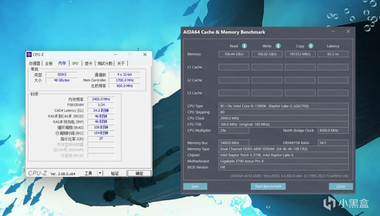 首先我们先在主板BIOS里打开XMP,并打开技嘉主板的高带宽,低延迟,进入系统后我们就可以看到,内存的频率已经达到了6800,时序仅CL34。这里我先用鲁大师跑一下内存的跑分,然后再用AIDA64的内存测试工具测试一下内存条的读取、写入、拷贝、延迟表现,结果如图,大家可以先记一下,后续我们会和超频后的进行对比。