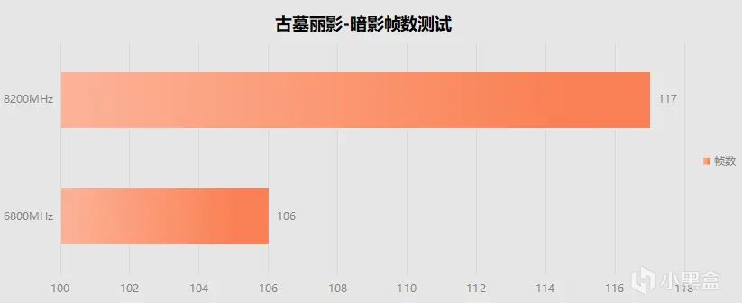而更高的频率也能够让我们在一些游戏中获得更高的帧数,从而可以更畅快的进行游戏。这里我也是的2K分辨率下,分别测试了6800MHz和8200MHz下的古墓丽影-暗影的帧数表现,通过测试,8200MHz下游戏的帧数相对于6800MHz,有了10多帧的提升。