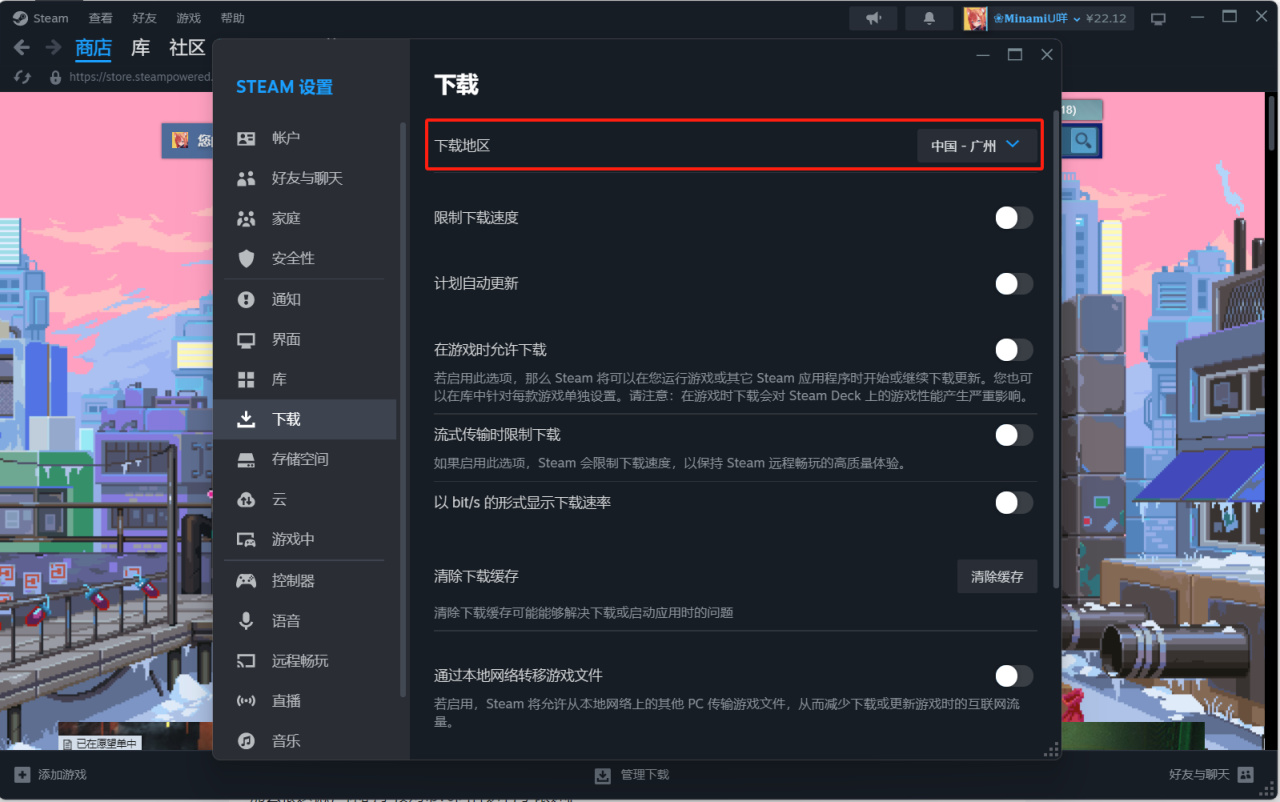 这边教一下大伙怎么切换下载节点,打开steam的设置,选择下载。里面有个下载地区就是了