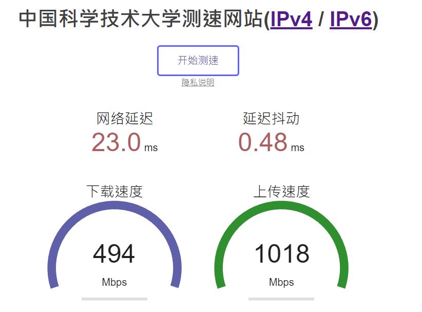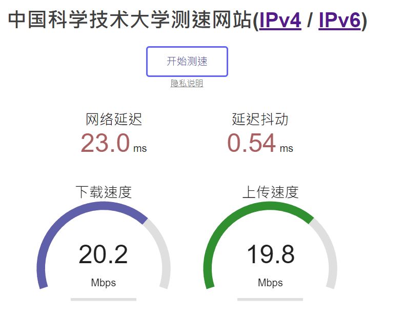 若是下载速度依旧是非常慢,那么可以透过中科大的测速网站分别测试一下ipv4和ipv6的网速,如果一样,那么很遗憾,你的学校对ipv6同样进行了限速。