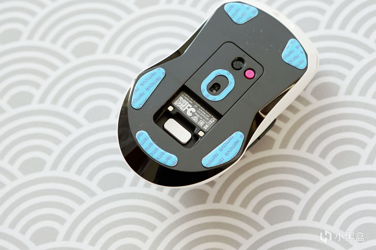 反過來底部採用了同色設計,腳墊比較寬大,並且在中間位置可以看到2.4G無線接收器的收納倉。