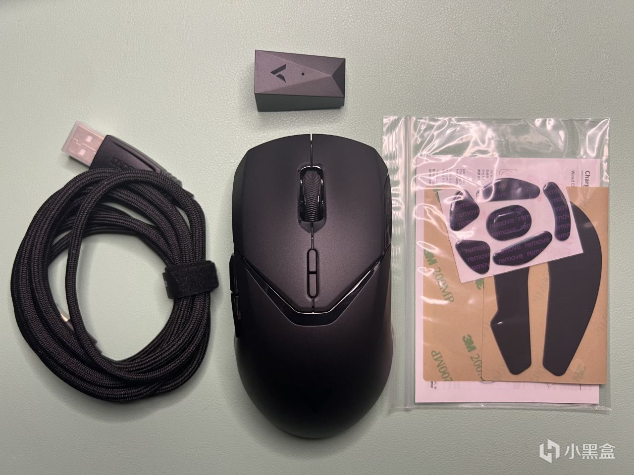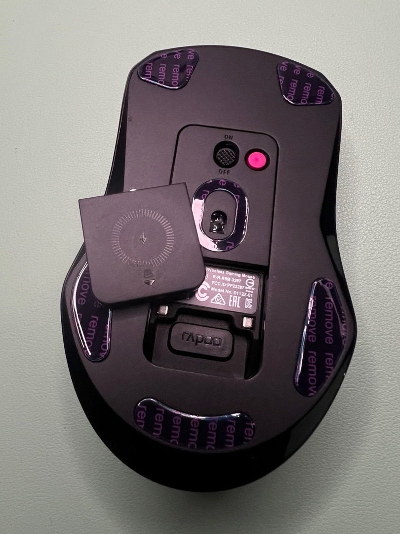 拆开上面的无线充电模块的包装,直接安装在鼠标的底部,在这里你就会发现鼠标内部藏着2.4g接收器,这就很nice,不会容易弄丢,而且便于收纳,在这里我就不得不吐槽一下,之前我的vt9pro的那个群友,把我的里面的usb接收器搞丢了,虽然有着4k接收器也无关重要,但是没有这个还是很不爽,只能自己用了。对了,记得把底部的脚贴部分撕掉(remove),有些朋友可能买了鼠标好久都没发现,还在疑惑为什么鼠标这么滑?那就要检查一下咯。
