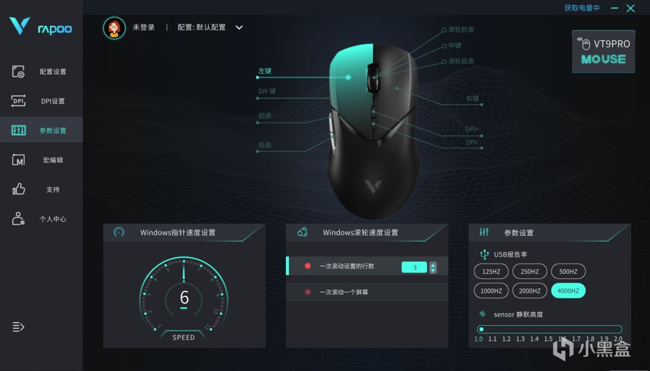 这个驱动界面十分简洁,更改dpi,录制鼠标宏等等功能,方便找到适合自己的频率和速度各种参数设置,当然我们可以看到4k连接前后,右下角的参数,多了几个档位,最开始只能调节到1000,现在能调整到4000,而且注意到了嘛,最开始那个线,就是连接4k接收器,把它连接并把拖到鼠标最近的地方,让鼠标更好地运行。