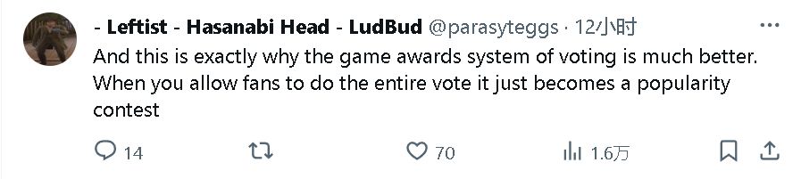这也正是为什么TGA的投票系统要好得多的原因。如果让粉丝来投票,那就变成了一场人气竞赛。