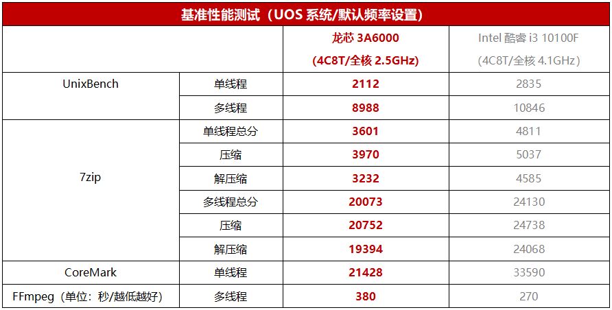 在发布会上,龙芯中科展示了龙芯3A6000与酷睿i3 10100的部分测试数据对比,这里我们另外补充了一些项目的测试数据供大家参考,虽然使用的是酷睿i3 10100F,但它和酷睿i3 10100相比只是没有核显,处理器部分是完全相同的。