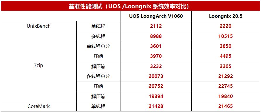 我们还额外对比了龙芯3A6000使用UOS系统和Loongnix系统的性能差异,从测试结果来看,Loongnix系统下龙芯3A6000的各项测试成绩表现都更好一些,毕竟是自家的系统,优化方面也许更加到位一些。