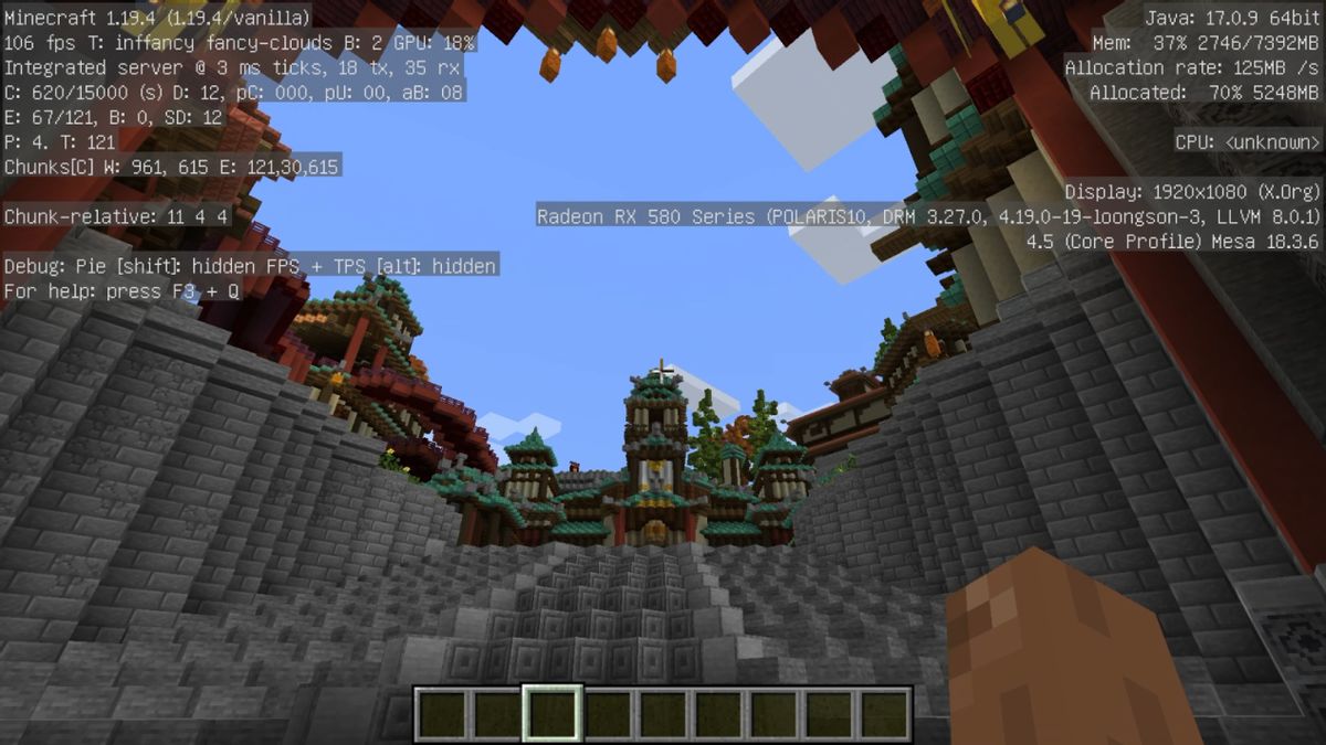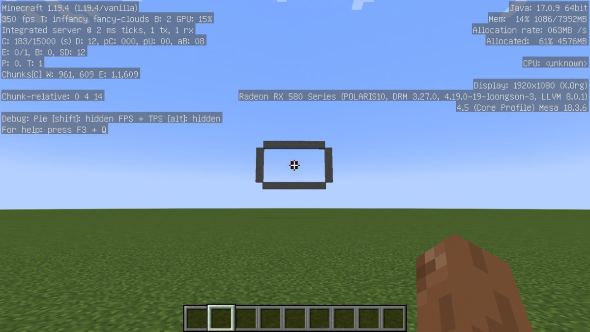 对于一般消费者来讲,游戏应用显然也是有需求的。原生支持龙芯的游戏并不多,但跑在JAVA上的《我的世界》是可以原生支持龙芯的,毕竟龙芯有原生的JAVA JDK。从测试来看,龙芯3A6000的流畅度非常不错,从截图可以看到,定点测试场景中可以达到350fps左右,复杂场景的璃月地图也有超过100fps。