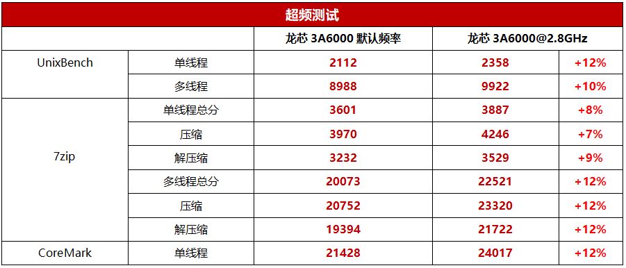 华硕XC-LS3A6M可以对龙芯3A6000进行超频,经过我们的尝试,在电压增加到1.2V的情况下,处理器可以稳定运行在2.8GHz频率下,而且此时满载最高温度也不到60℃。超频后龙芯3A6000的性能进一步提升了10%~12%,比较符合频率的增长幅度。如此看来,如果下一代龙芯处理器可以将频率进一步提升,那么性能也会有着线性的增长规律。