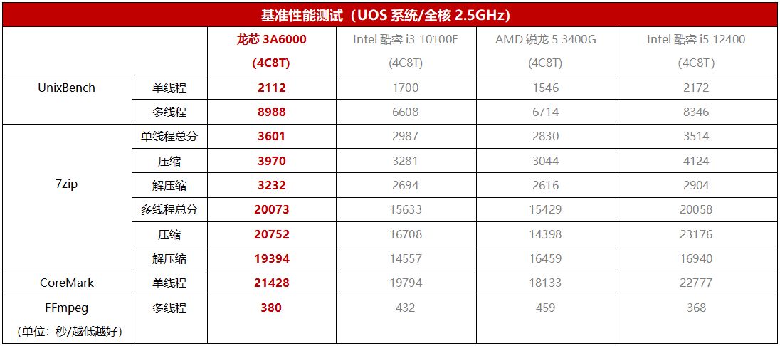 那么如果对比的处理器都保持全核2.5GHz的工作频率,测试结果又是如何呢?我们将酷睿i3 10100F、锐龙5 3400G以及酷睿i5 12400都手动设置为全核2.5GHz与龙芯3A6000进行对比,结果令人十分惊喜。从表中可以看到,同为全核2.5GHz的情况下,龙芯3A6000所有的测试成绩都明显超越了酷睿i3 10100F,其中UnixBench单线程领先幅度甚至高达24%,多线程更是领先36%,7zip的单线程与多线程总分也分别领先了20%和28%之多,相对锐龙5 3400G的领先幅度甚至更大,和酷睿i5 12400(4C8T)也打了个有来有回。由此可见,在2.5GHz频率下,龙芯3A6000的IPC已经完全赶上了主流处理器的水准,相对较早的X86处理器优势还很明显。
