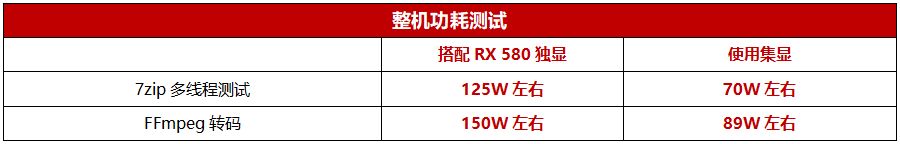 功耗方面,我们分别搭配RX 580独显和集显进行测试。从测试结果来看,在使用集显的情况下,龙芯3A6000整个平台运行FFmpeg转码功耗不到90W,比较符合预设的功耗水平。当然,搭配独显后整机功耗大幅提升,这也是因为RX 580本身的待机功耗就比较高的原因,和龙芯3A6000无关。