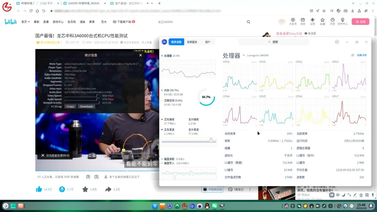 最后,我们还模拟了一下日常办公的实际情况:先打开十几个不同的网页,比如在B站看视频;接下来打开音乐网站听听歌;再打开前面测试用的Word、Excel、PPT文件;再启动GIMP编辑图片。这种状态下处理器占用大概是40%多,内存占用81%,此时切换各个应用窗口还是比较流畅的。这样来看的话,龙芯3A6000满足日常工作的性能需求是没有什么问题的,甚至比一些还在使用的4核8线程办公机体验更好。
