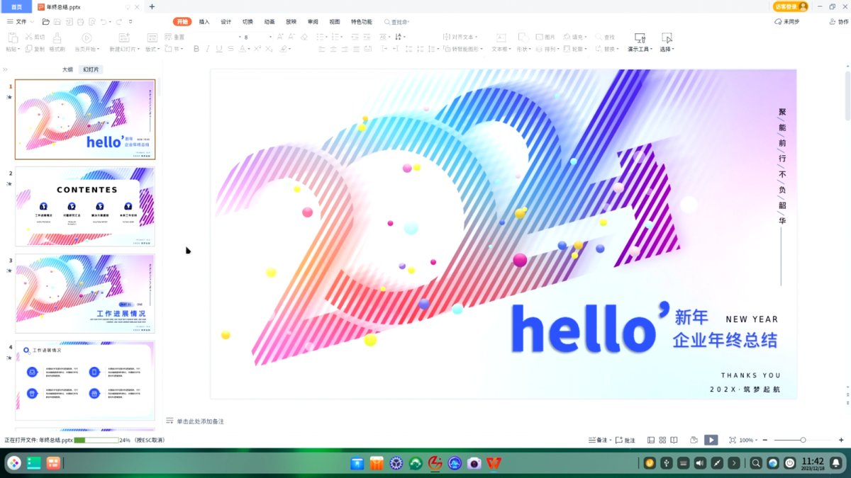 办公软件部分,有 WPS的龙芯版,虽然版本晚于Windows版,但基本功能用起来是没有什么问题的。我们还特意分别打开了一个40万字的Word文档、一个200MB的Excel文件和一个160页的PPT,龙芯3A6000都表现得很流畅,标签切换、缩放、拖动等操作都没有卡顿。