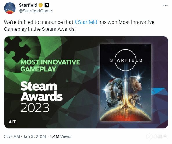今日,由玩家票选的 2023 年 Steam 大奖获奖名单正式公布,其中由 Bethesda Game Studios 制作发行的角色扮演新作《星空》获得了最具创意游戏玩法奖;官方在第一时间发文庆祝和分享自己的喜悦,但是却遭到大量网友的嘲讽: