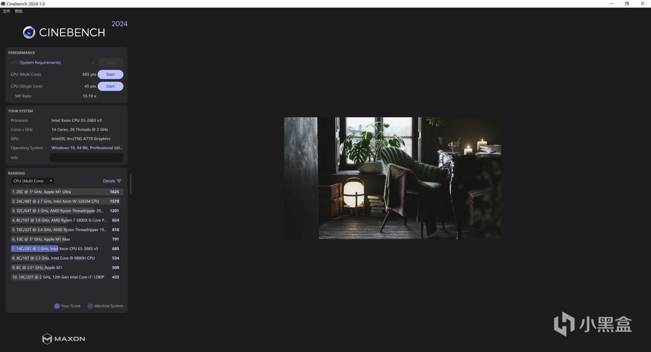用CINEBENCHR 2024软件测试,单核性能:45 pts,多核性能:685 pts,MP Ratio:15.10 x。