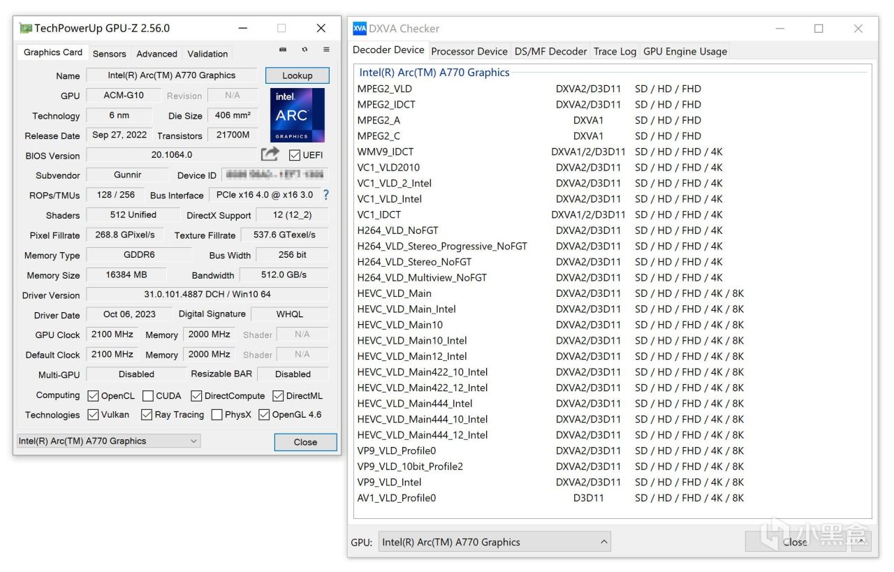 可以看到A770显卡用GPU-Z和DXVA Check软件检测出来了,视频解码能力I卡就是有优势啊。