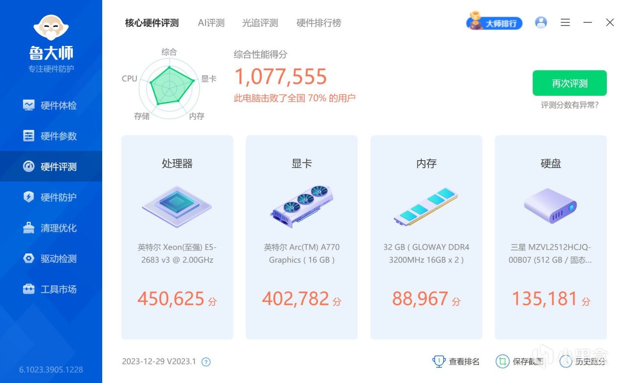 用鲁大师测试,电脑综合性能得分:107.7万分,其中处理器得分:45万分,显卡得分:40.2万分,内存得分:88.9万分,固态盘得分:13.5万分。