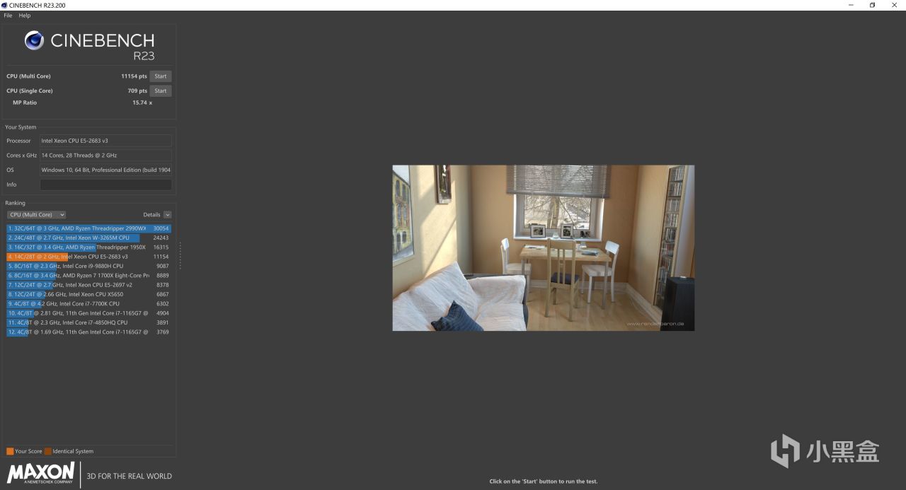 用CINEBENCHR 23软件测试,单核性能:709 pts,多核性能:11154 pts,MP Ratio:15.74 x。