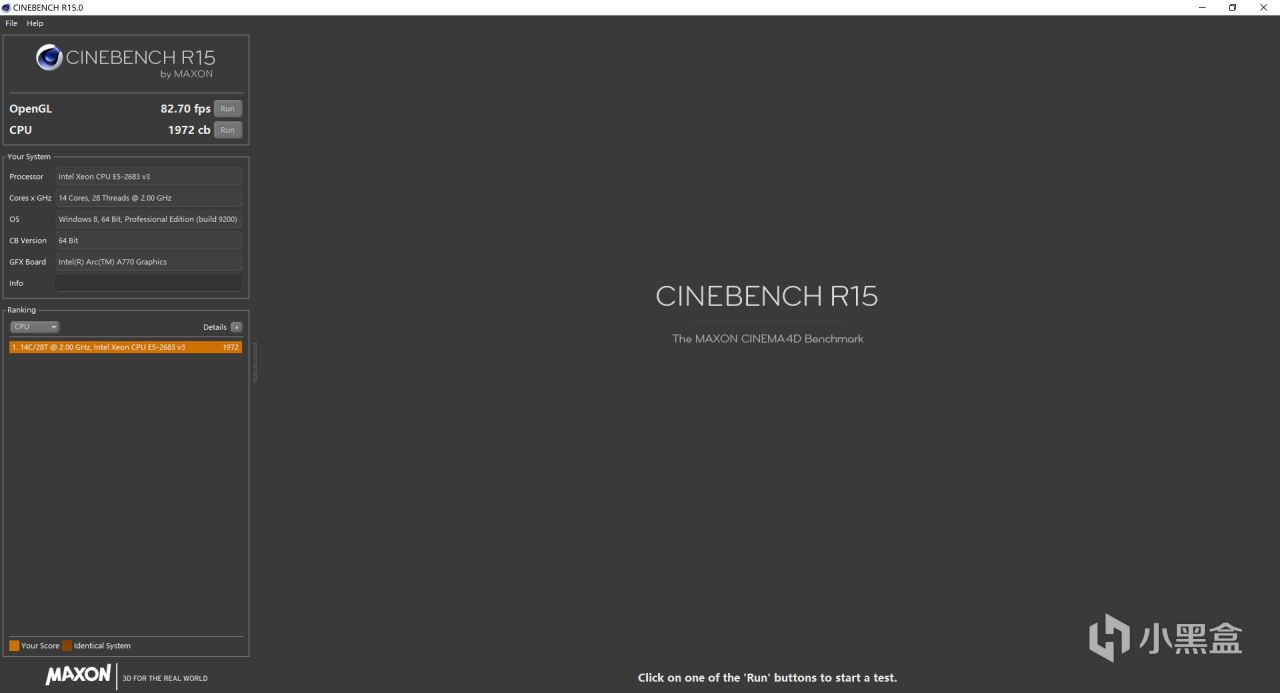 用CINEBENCHR 15软件测试,CPU:1972 cb,OpenGL:82.70 fps。