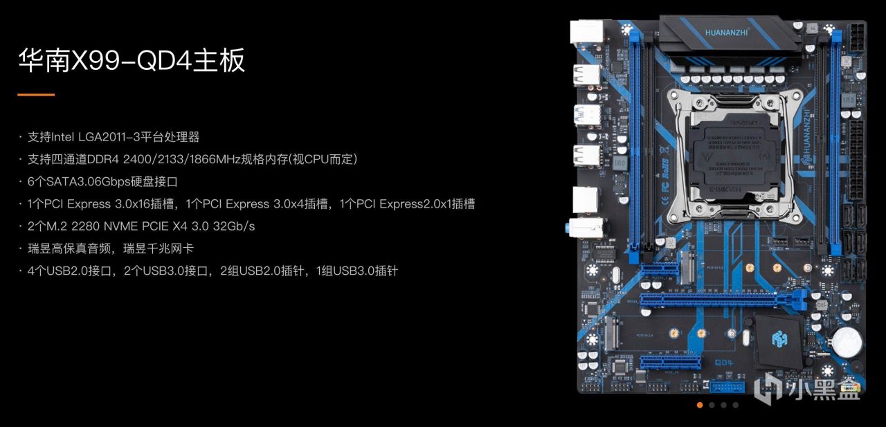 ✔️ 华南金牌X99-QD4主板,带有全速PCIe 3.0 M.2 SSD插槽,板子用料在这个价位来说该有都有。