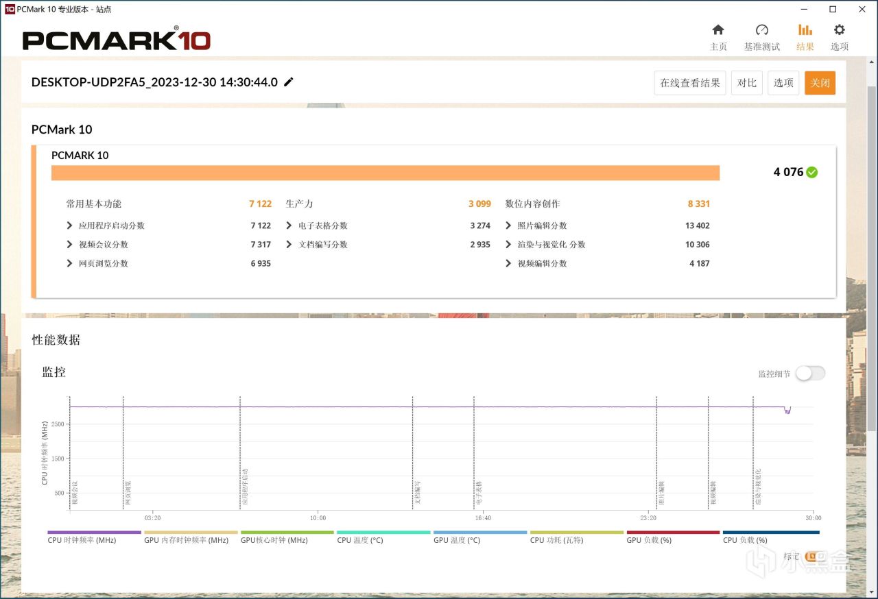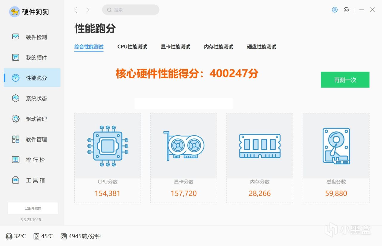用硬件狗狗测试,核心硬件性能得分:40万分,其中CPU得分:15.4万分。