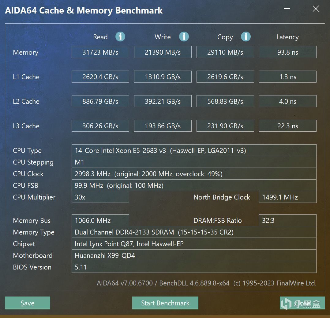 华南金牌X99-QD4主板默认DDR4-2133频率下用【AIDA64】软件测,读取速度:31723 MB/s,写入速度:21390 MB/s,拷贝速度:29110 MB/s,延迟:93.8 ns。