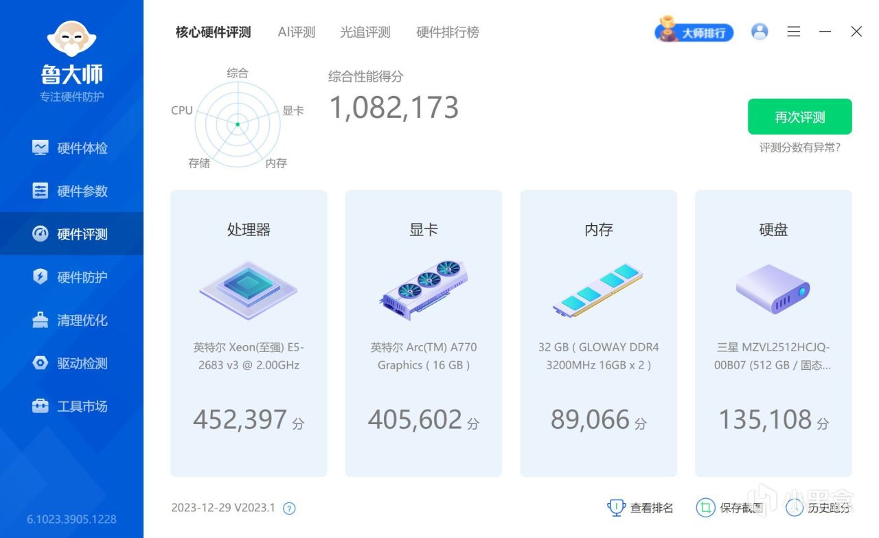 用鲁大师又测了多遍,选取最高分的记录。实测鲁大师的电脑综合性能得分:108.2万分,其中处理器得分:45.2万分,显卡得分:40.5万分,内存得分:89万分,固态盘得分:13.5万分。