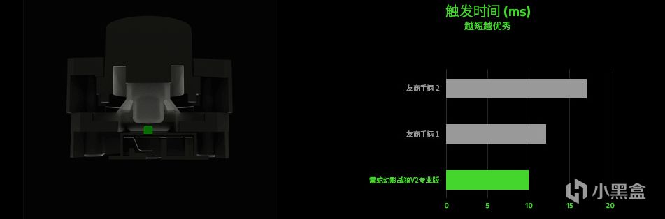 触发距离只有 0.65 毫米,比普通手柄的触发距离少 35%,触发时间约为 10 毫秒。