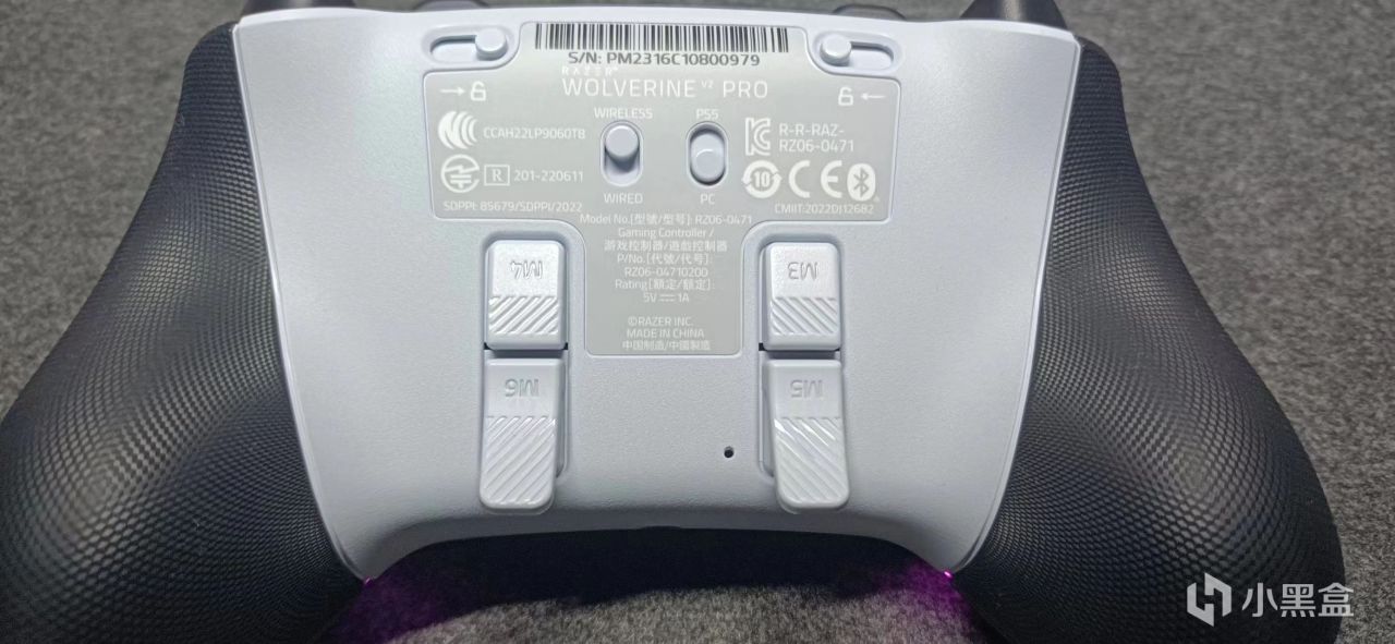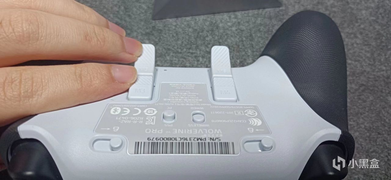 手柄背面则是几个模式切换键以及额外的4个背键,标识为M3-M6。比较特殊的是,四个背键都是长条形状的,由上往下进行左右排,手感偏硬。背部其他按键还有两个扳机锁,有线无线模式切换键,ps5和pc切换键。
