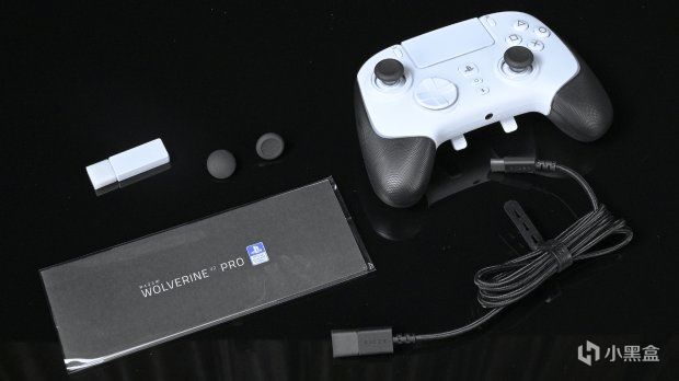 包装上这次的雷蛇的幻影战狼V2专业版,倒是一切从简。包装盒比正常索尼手柄要大,打开外包装后,里面手柄被两块大海绵像夹心宝宝一样夹在中间,不得不说包裹性和保护性满分。随手柄附赠的产品有两个替换遥杆帽,一个2.4g接收器,以及一条数据线和一本根本不看的说明书。