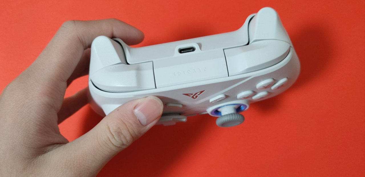 手柄的顶部也就是一个充电口,肩键与扳机键嘛!这原来并没有什么可讲的,但是我发现它上面也是做了和背部一样的钻石防汗纹处理,所以说也还是较为方便的,整体上较为适合手汗玩家使用,再说说顶部的扳机吧,这个其实应该不用多讲,霍尔线性扳机嘛!永不磨损,使用寿命可以大大提高,且因为是线性班机,对于赛车游戏的体验可以说很不错的。