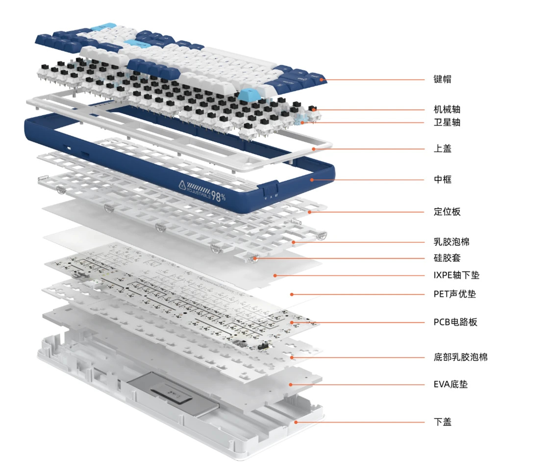 ▲ 达尔优 是 最早将 Gasket结构量产化的厂家 ,这次“价格卷王”A98专业版三模机械键盘 自然还是继续配置了 Gasket结构 ,配合 顺滑的天空轴V3 以及 稳定的蓝牙、2.4G无线连接 ,我打游戏的感觉更爽了!办公打字速度也起飞!