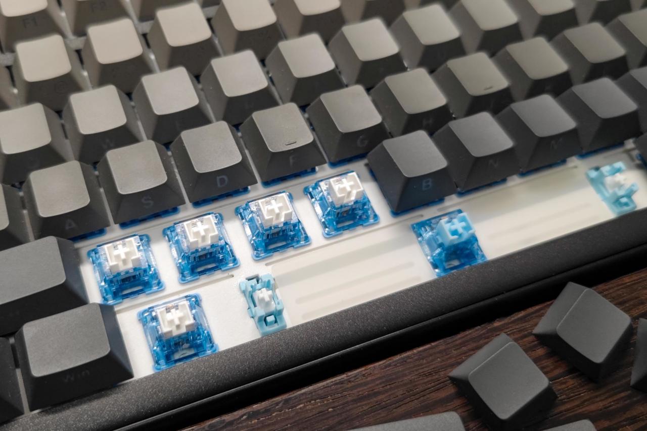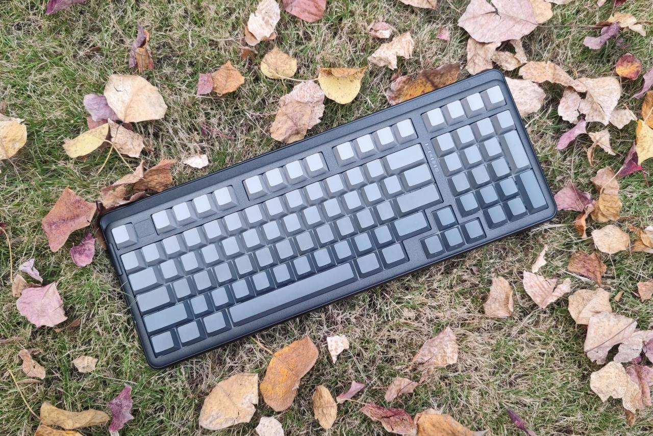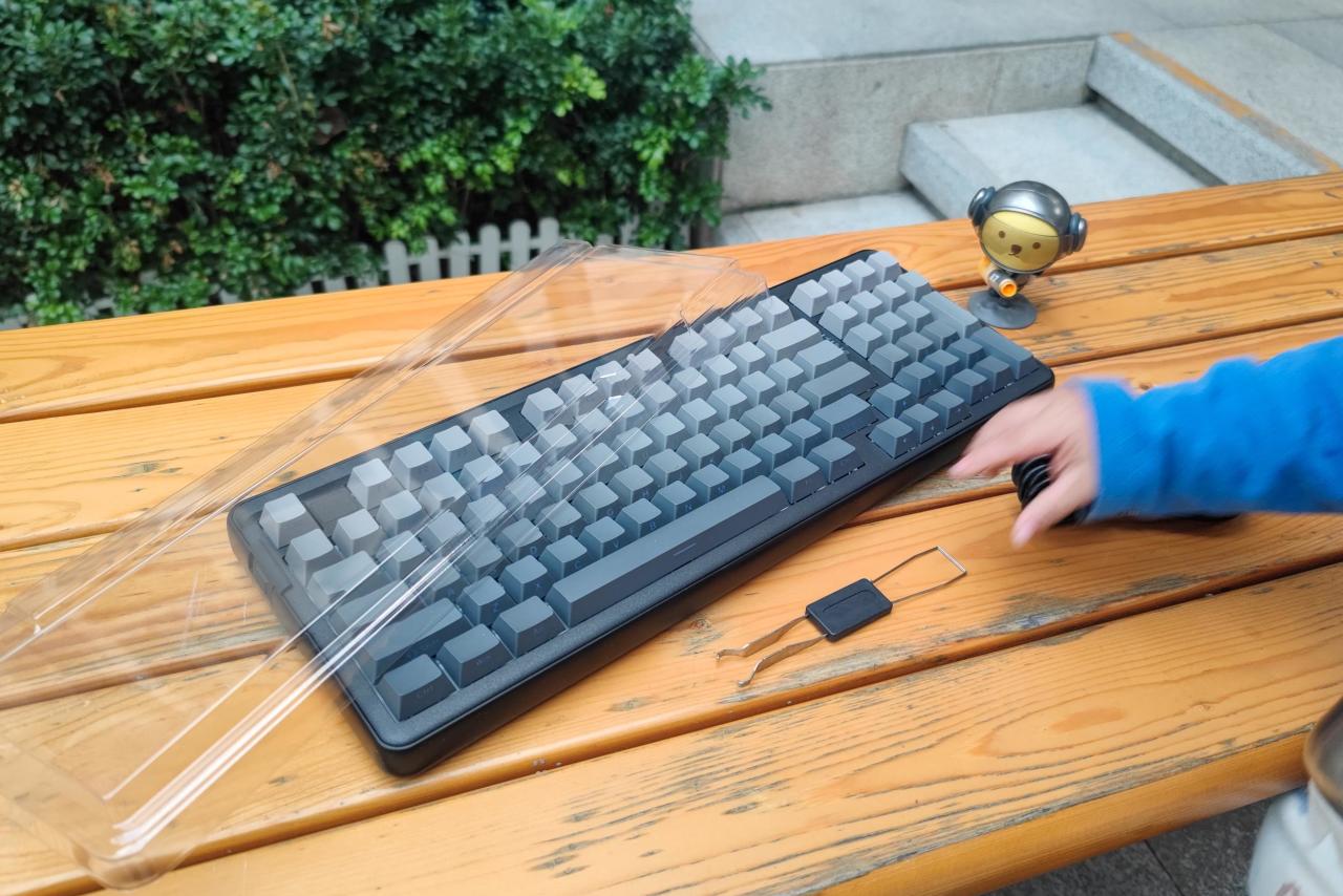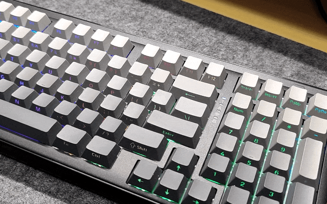 ▲耀哥哥我选购的是 白烟青 配色,并且键帽还是 侧刻 的,正面看上去特别素,但却有一种工业风美感,我觉得很对我的直男审美胃口。布局则是采用 98%配列 ,更加节省地方,同时也方面我办公的时候使用小键盘,特别好评~