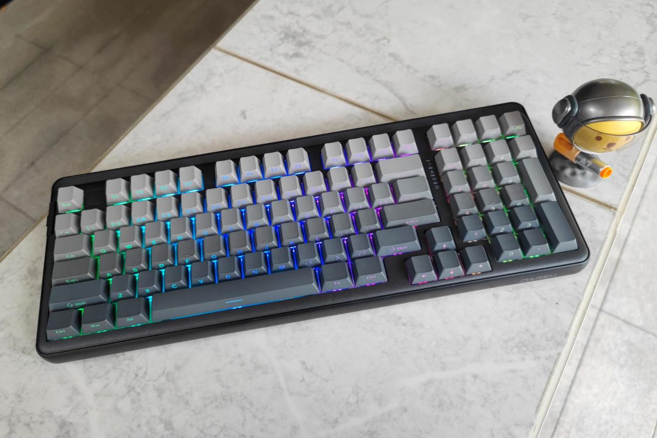 耀哥哥我这次入手的达尔优A98专业版三模机械键盘 白烟青侧刻版(天空轴V3)整体体验下来,用“物超所值”来描述足矣! 无论是渐变圆润的线条、顺滑无比的敲击体验,还是Gasket结构及单键开槽PCB、绚烂饱满的RGB灯光配上三模连接,这样的体验何其优秀!值得关注!