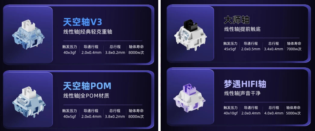▲而轴体更是推出了四种可选,分别是:天空轴V3、天空轴POM、大师轴以及梦遇HIFI轴。