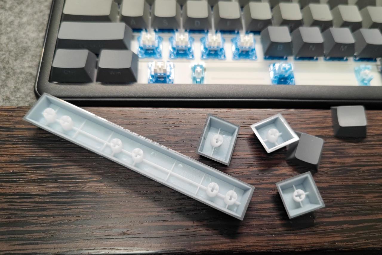 ▲键帽采用的是 PBT球帽高度键帽 ,触感好,干爽不易打油,更耐磨耐用。并采用了 二色成型工艺 ,键帽没有多余毛刺,整体制作水平相当可以。