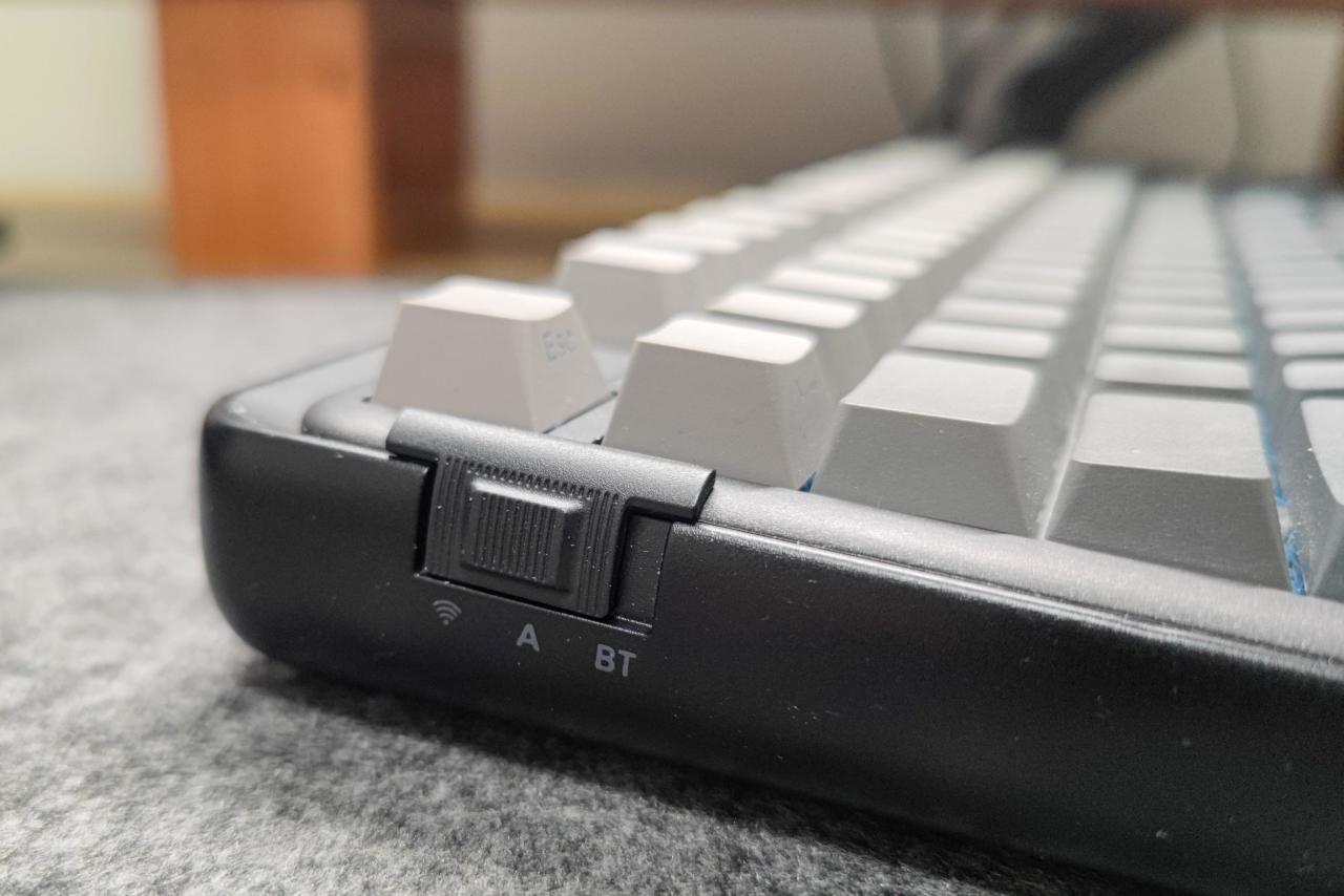 ▲ 达尔优A98专业版三模机械键盘 拥有 蓝牙/2.4G/有线三种连接模式 ,只需要轻轻拨动键盘左侧的拨动开关即可。