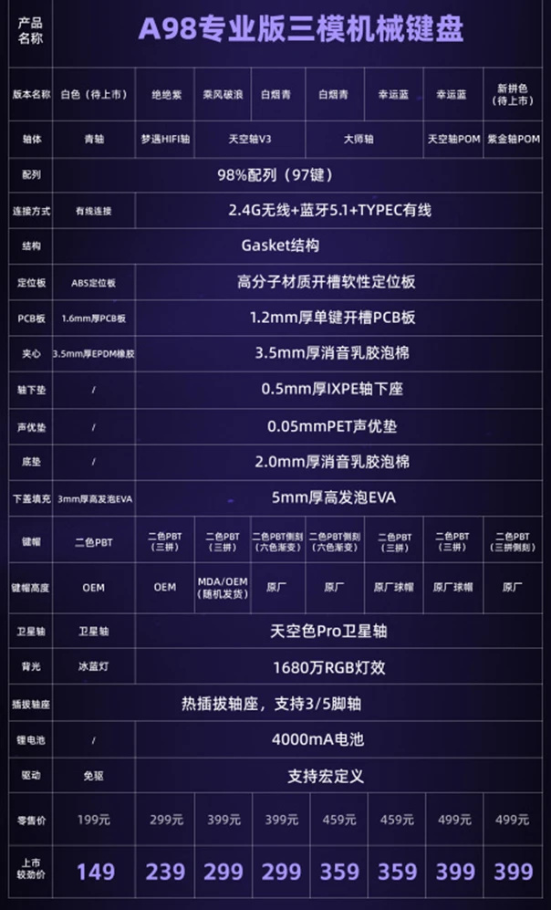 ▲ 达尔优A98专业版三模机械键盘 共推出了四个颜色:绝绝紫、白烟青、乘风破浪以及幸运蓝。