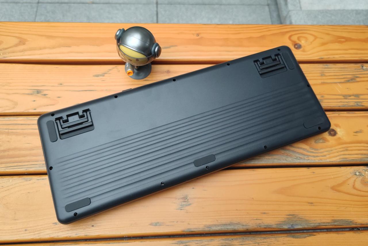 ▲ 达尔优A98专业版三模机械键盘 的整体设计风格是比较圆润的,键盘的底面同样也看得出来,五块硅胶防滑垫加持下,防滑效果非常显著。左右两边还有个面积特别大的脚撑。