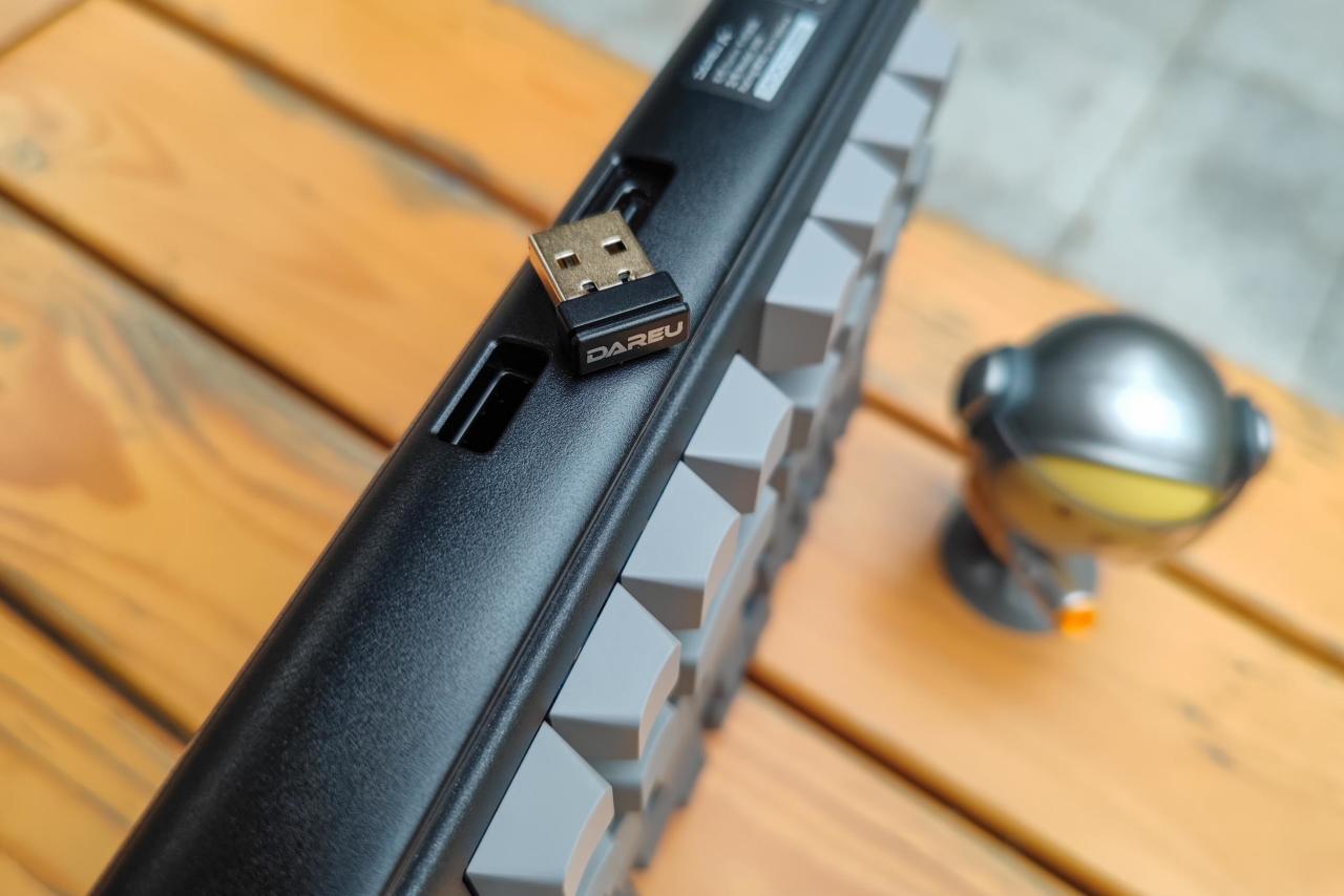 ▲从键盘顶侧面可以看到 Type-C电源连接口 以及 一个收纳妥当的2.4G无线接收器 。