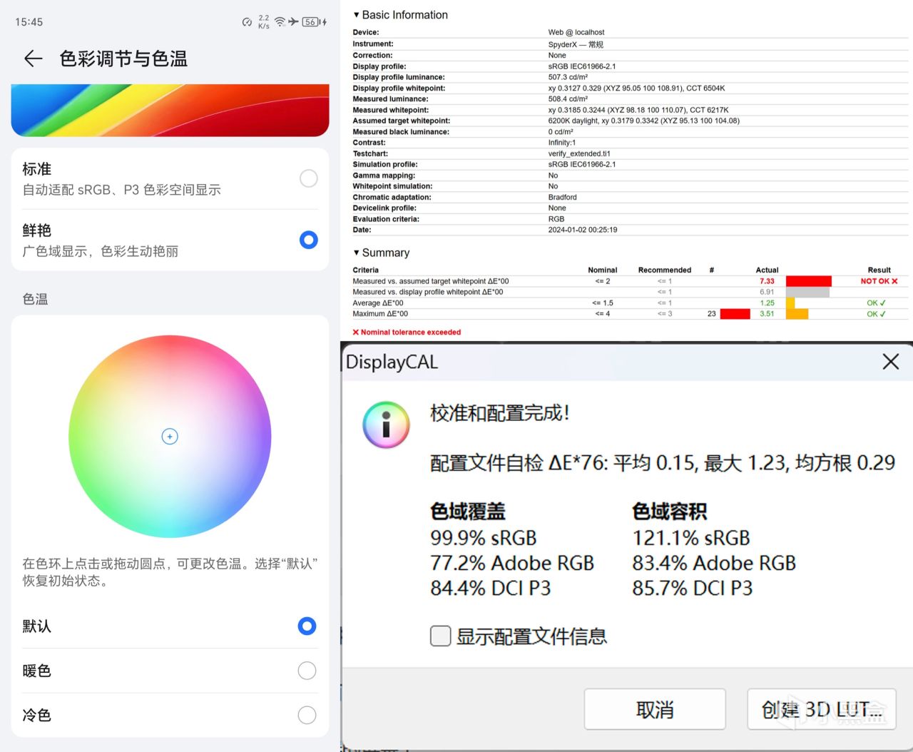 实测标准模式下,平均ΔE色准达到了1.25,接近1的优秀水平。鲜艳模式下色域覆盖达到了99.9%的sRGB和84.4%的DCI-P3,色域容积达到了121.1%的sRGB、85.7%的DCI-P3。
