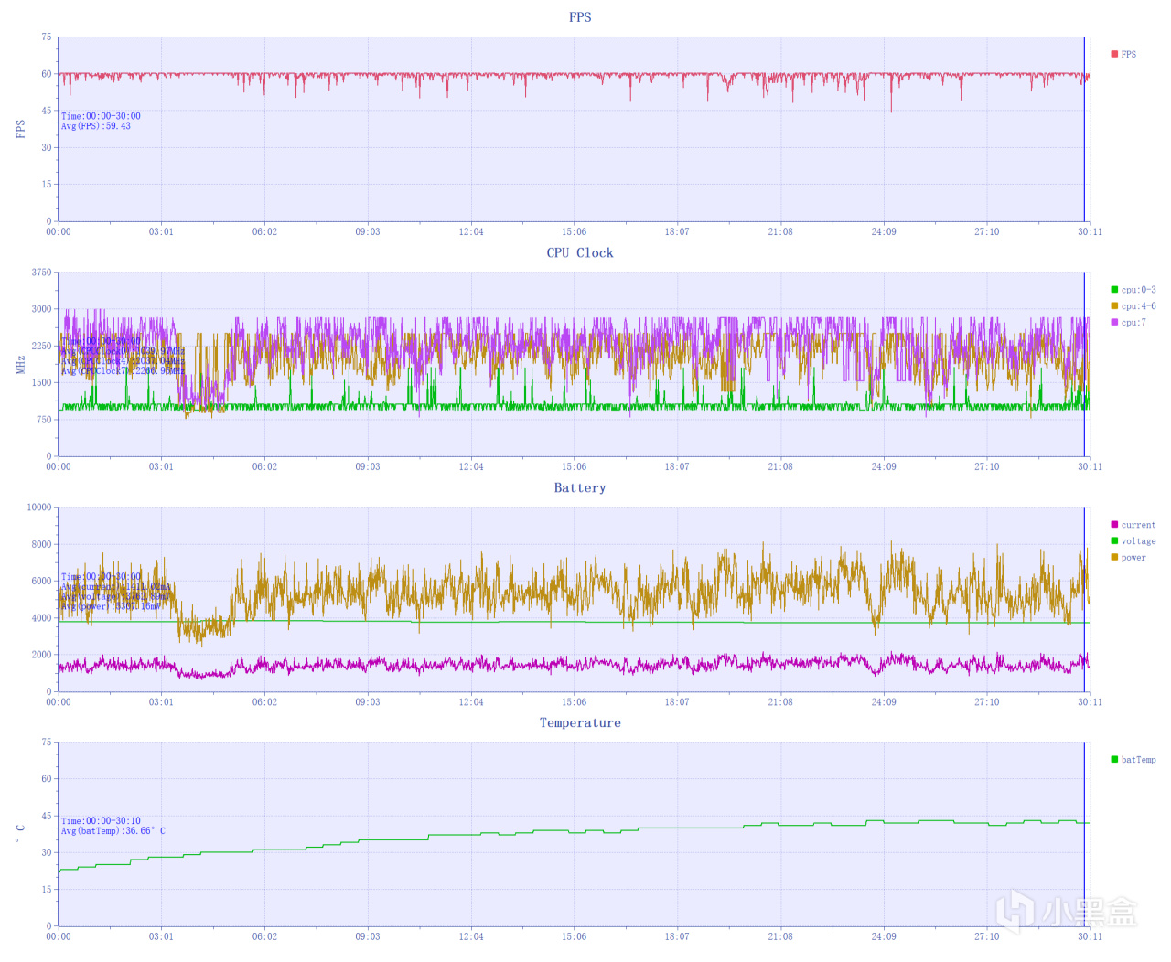 30分钟原神全高60帧,帧率图多少有轻微波动,但平均下来也能达到59.43。