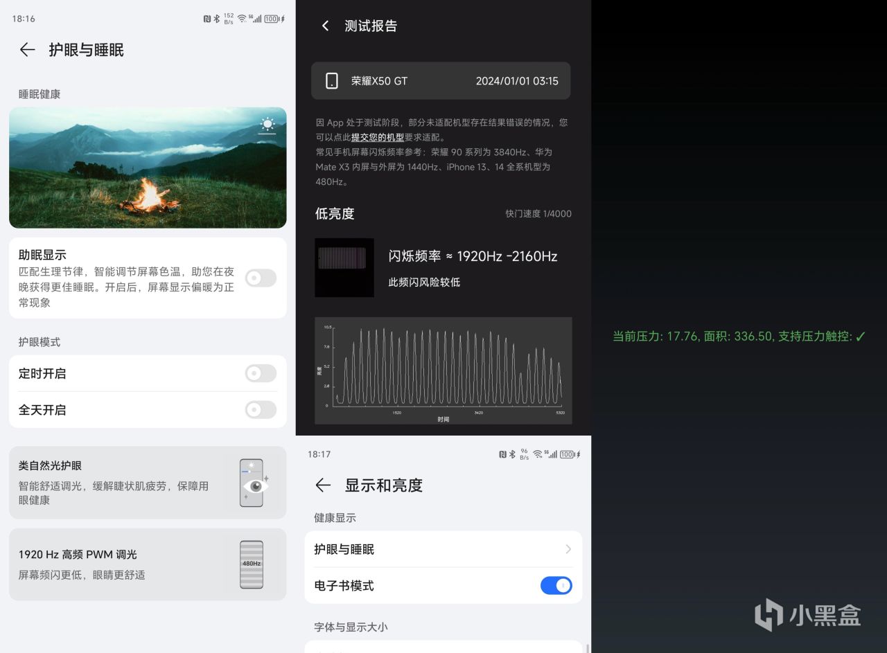 这次,荣耀同样将自家处于行业引领级别的屏幕护眼技术下放到这个价位。1920Hz高频PWM调光的基础上,加入了类自然光护眼技术和助眠显示技术,同时也支持之前的电子书模式。