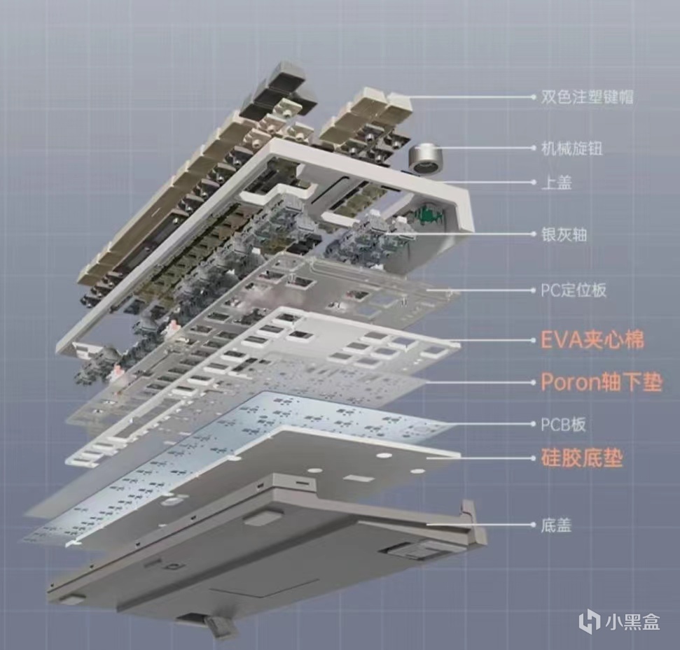 另外使用了最优的消音结构方案“EVA夹心棉+轴下垫PORON棉+硅胶底垫”,在消音的同时发挥原声的最优效果,并且底垫升级更换为硅胶后其绝缘性能更好地保护PCB电路版,使用下来还是不错的。