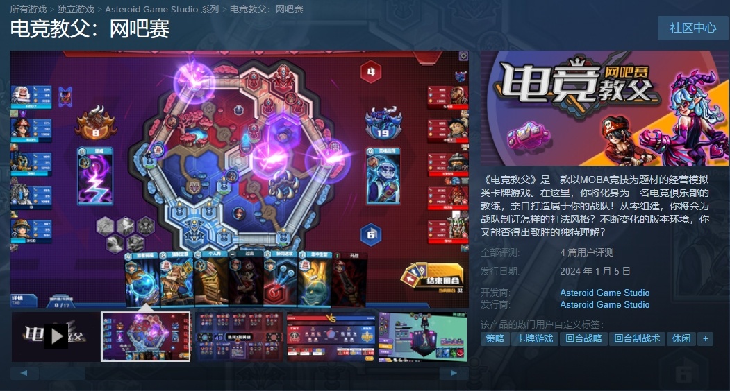 今日(1月5日),策略卡片游戏《电竞教父:网吧赛》上线Steam,游戏支持简体中文,免费开玩。