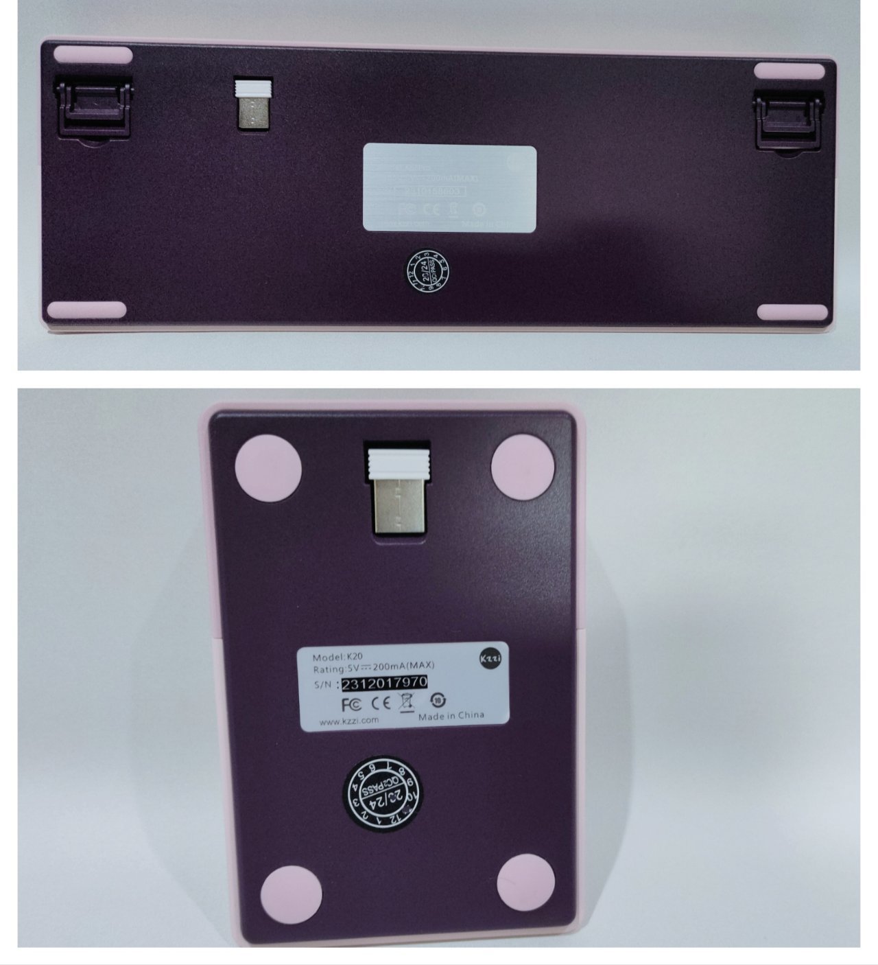 背部呢k68pro拥有两个二段式脚撑,下方两侧为硅胶脚撑,并且它还带有一个2.4G收纳仓,他是磁吸的,如果平常不用的话,收纳起来还是很方便的,并不容易丢失。K20的话四个就都是硅胶教程了,底部也是一个2.4收纳仓,便于收纳。