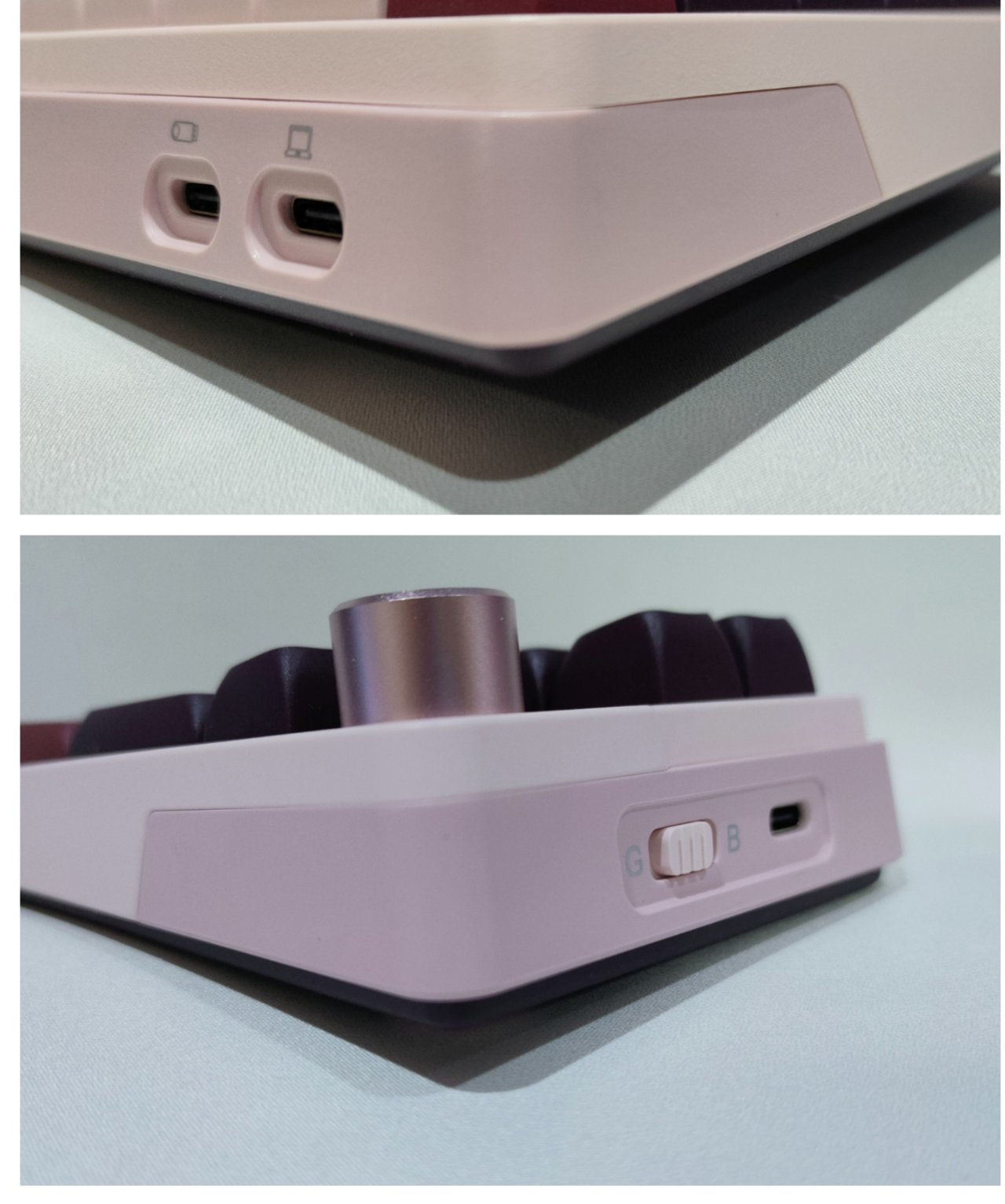 k20的顶部呢也就是一个充电接口与模式切换开关,支持有线,蓝牙,2.4g。k68pro的顶部有两个接口你可以用来充电,但是你也可以用来进行外部拓展,这个功能我感觉是很方便的比如说你电脑没有插槽的时候你可以把硬盘,耳机的2.4g接收器插上面,但是前提是你的键盘需要和电脑有线连接然后另外一个插口才能进行拓展,并且这个口是c口,所以你的2.4g接收器或者硬盘也得C口或者你去买个转换器就行,个人感觉平常应急的时候还是很不错的,并且这玩意还能连接k20,直接可玩性拉满了哈哈